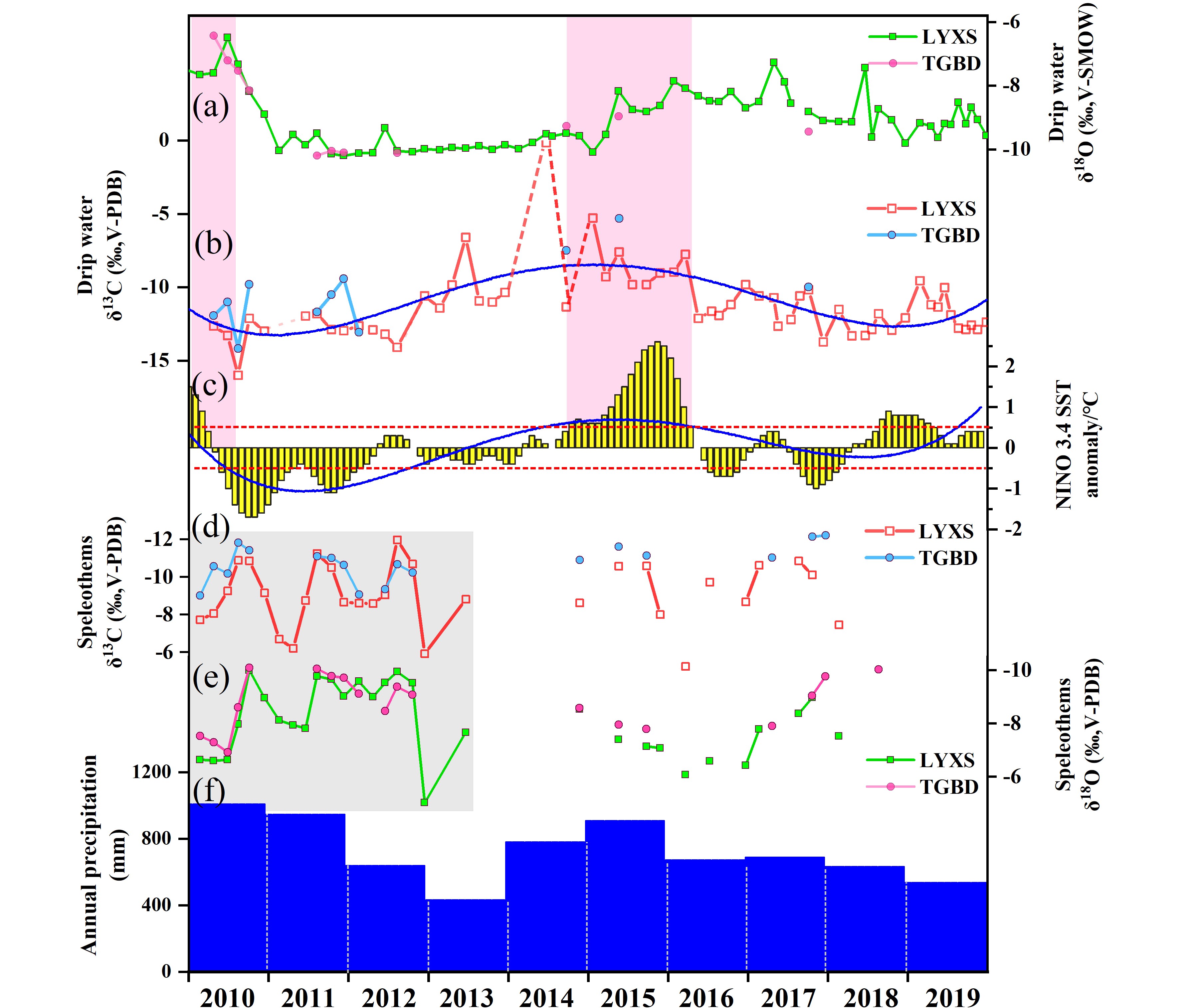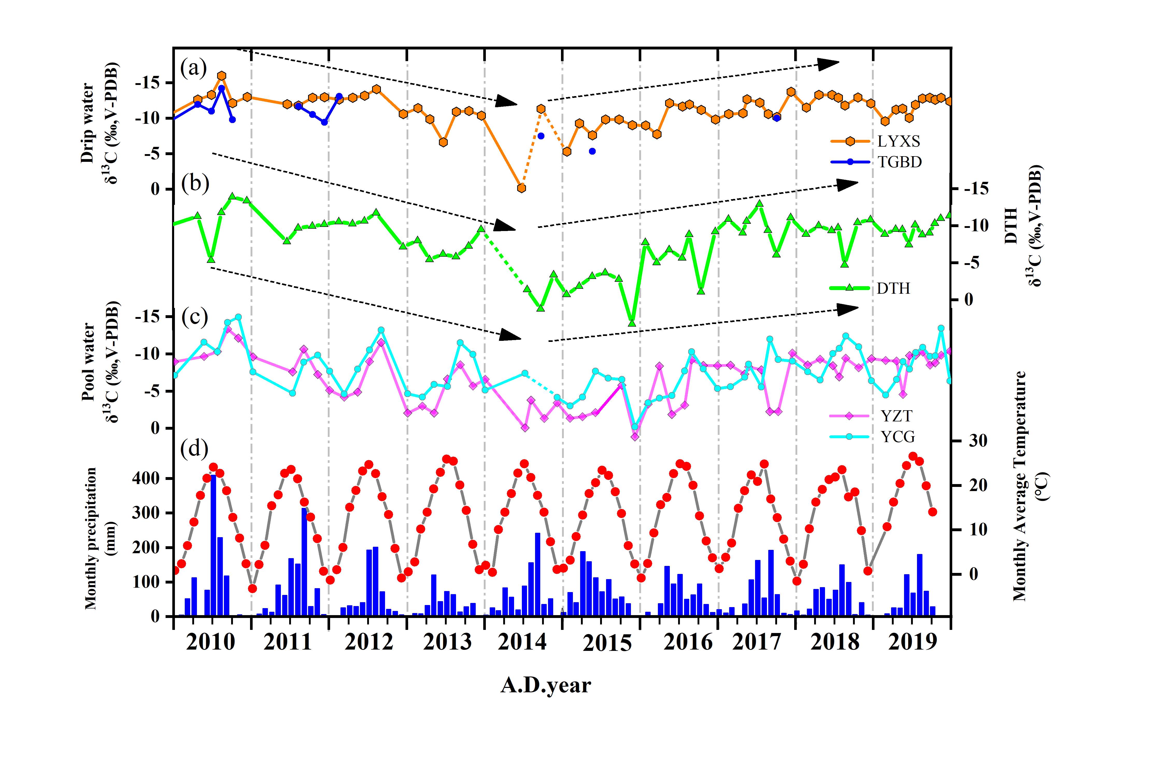 在连续4个国家自然科学基金项目(40902053413721774167216041877450)的支持下,从200910月至今,杨琰教授研究小组对我国南北交汇带秦岭余脉伏牛山北麓河南西部洛阳栾川鸡冠洞进行连续11年的监测。论文通过分析洞穴系统各部分碳同位素和洞穴水微量元素组成,并与附近东石崖洞近70年来石笋δ13C记录进行对比,研究发现:(1) 洞穴水δ13CDIC具有明显的季节和年际变化。夏季相对较高的土壤CO2以及洞内空气停滞导致洞穴水δ13C值偏负,冬季则相反。年际尺度上,洞穴水的碳同位素和微量元素比值反映了外界气候的干湿状况,对夏季风降水减少引起的极端干旱事件敏感 (1)(2) δ13C信号在岩溶洞穴系统(植被-土壤-滴水-沉积物)运移过程中不断富集,虽然滴水δ18Oδ13C都可以响应ENSO,但驱动机制不同。滴水δ13C反映受ENSO影响的降水量变化,而滴水δ18O反映与环流效应相关的降水δ18O水汽源的变化。由ENSO间接影响的滴水δ13C的变化可以同步转移到现代沉积物上 (2)(3) 毗邻东石崖洞石笋δ13C指示当地水文气候条件的变化并间接反映ENSOENSO通过降水量变化影响地表植被、生物量、土壤CO2产率和表层岩溶带及洞穴过程导致石笋δ13C变化 (3)