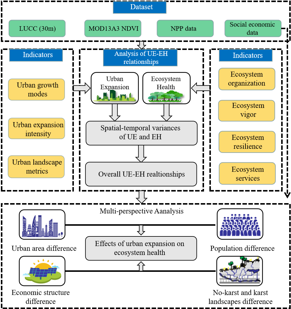 王勇副教授研究小组以西南地区438个城市为例,基于面板数据模型从人口密度、经济结构、城镇面积大小以及地质环境四个方面量化了城镇扩张(涉及城镇形态、城镇扩张强度以及城镇扩张模式)与生态系统健康之间的关系。研究发现随着城镇扩张强度的增加以及城镇增长模式由边缘扩张型向飞地型的转变,区域生态系统健康呈现出显著下降的趋势。其次,城市空间形态的规则性和紧凑性有利于中等城市和大城市生态系统健康水平的增加,而城市空间形态的复杂性对工业城市的生态系统健康具有显著的负向影响。同时,与非岩溶城市相比,岩溶城市的生态系统健康对城镇核心斑块的破碎度更加敏感。