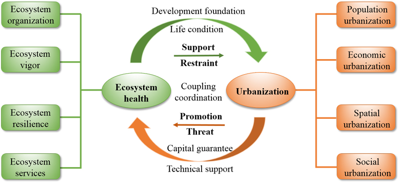 快速城市化严重干扰了自然生态系统的结构和功能,引发了许多生态环境问题。与此同时,生态环境的恶化也降低了城市化质量,威胁着城市的可持续发展。因此,厘清城市化与生态环境之间的相互作用机制和演化规律已成为当前城市研究的热点和前沿问题。许多学者已经从不同的方面探讨了城市化与生态环境的耦合关系,如水环境质量、空气污染、能源与环境效益、碳排放等。这些实证研究为进一步定性和定量研究城镇化与生态环境关系提供了重要参考。然而,以往研究中使用的生态环境指标与人为因素直接或间接相关,不能反映自然生态系统的本质。同时,很少有研究关注城市化与生态系统各组分(如结构、功能或服务)之间的耦合关系,不利于清晰地探讨人地系统之间的作用关系和影响程度。