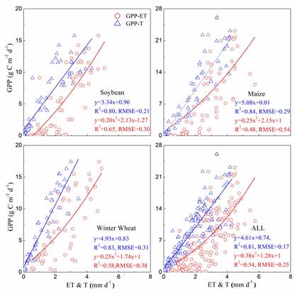 图3主要农田生态系统GPP与ET或T的相关关系