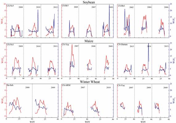 图2 大豆、玉米和冬小麦站点在8天时间尺度的WUEET和WUET的季节动态变化