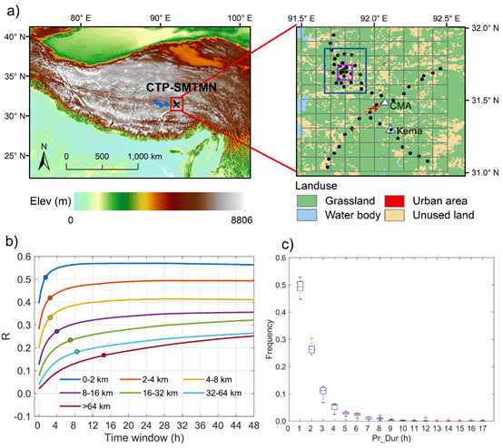 (a)青藏高原多尺度土壤水分观测网;(b)站点间累计土壤水分增加量的相关性随时间尺度和空间距离的变化,其中不同颜色表示不同距离分组;(c)由观测网中部降水观测统计得到的该区域降水时间尺度频率分布。