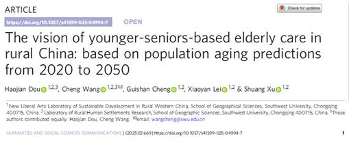 近日,学院王成教授课题组在《人文社科通讯》(Humanities & Social Sciences Communications)发表了题为“The vision of younger-seniors-based elderly care in rural China: Based on population aging predictions from 2020 to 2050”的研究论文(图1)。该研究基于中国2020年至2050年乡村人口老龄化趋势预测结果,揭示了乡村老年人口增长趋势和空间异质性、提出了“以老养老”愿景,并在全球尺度论证了其适用性和可行性,该理念对积极应对农村老龄化、实现可持续发展目标具有重要意义。