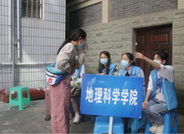 地科院新生入校,首先需要携带录取通知书、身份证原件、健康码“绿码”、行程码“绿码”和核酸检测阴性证明,在进入校园时提供给工作人员核验,然后在学校志愿者的引领下找到自己的宿舍楼下。在地科院的迎新登记服务点进行报道并领取新生纪念地图后,就到宿舍管理员值班室进行信息的登记并领取宿舍钥匙,到达寝室后需第一时间向辅导员报告“已入住”。在新生们将寝室整理好后,重庆市外来校同学需要携带身份证去第二运动场进行一次核酸检测。当检测完毕后,向辅导员报告,并尽快返回寝室。在核酸检测结果出来之前争取做到宿舍和食堂之间“两点一线”,以响应学校对疫情防控的要求。