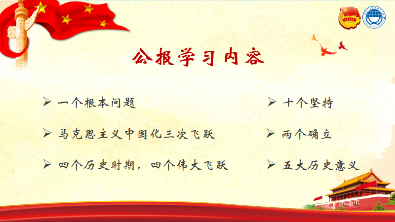 轻松愉悦之后,回归正题。由主持人翁瑜泽、任秋帆同学带领同学们进行第十九届六中全会公报学习,内容包括一个根本问题、两个确立、十个坚持、五大历史意义等会议纲领。