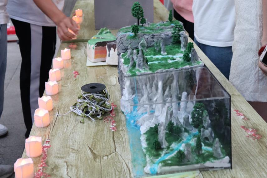 本次活动包括科普展览、天文观测、趣味游戏等内容。科普展览以“走进自然,环保低碳”为主线,讲述了碳的“前世今生”。活动现场,同学们被各类形状各异的岩石标本、制作精巧的地理模具吸引,纷纷驻足观看。一块块奇特的岩石、一件件制作精巧的地理模具纷纷映入眼帘,有恍若幽蓝月光的“月亮石”,有颜色酷似孔雀羽毛的“孔雀石”等。由地科院学生亲手制作的地理模具,还展示了在漫长地质历史中和特定地质条件下,碳酸盐岩地区洞穴内形成的石钟乳、石笋、石柱等。