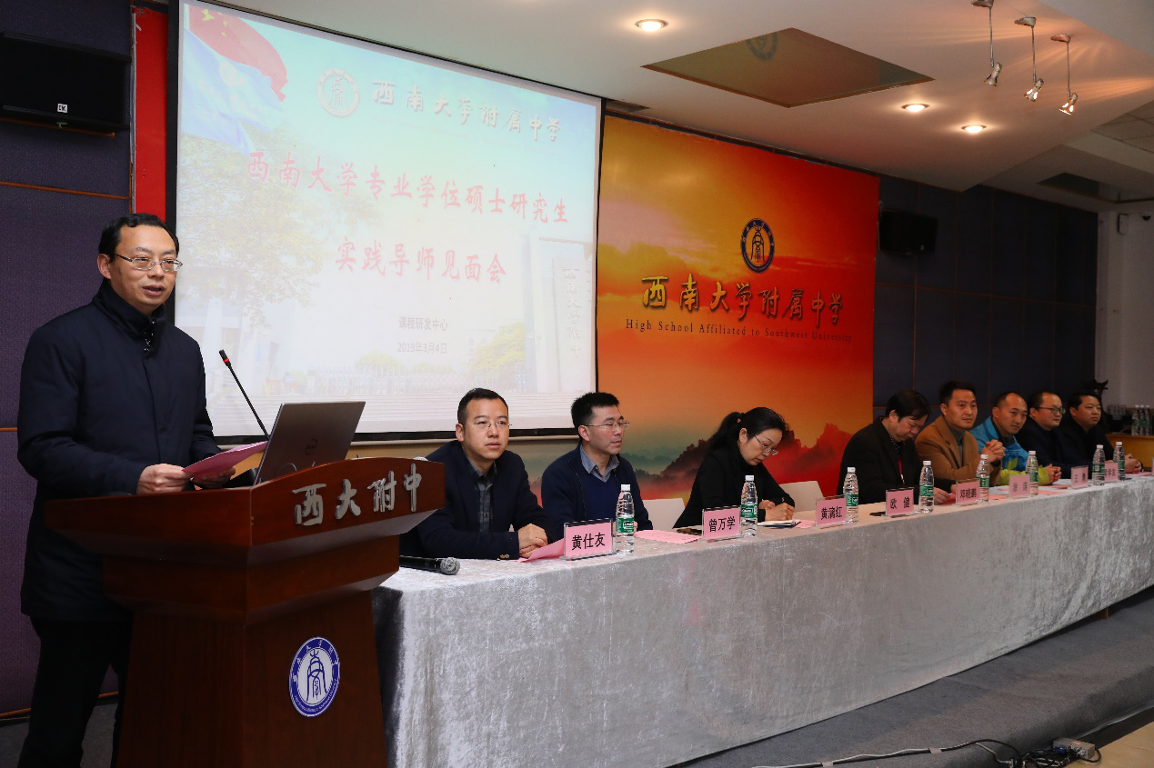2019年3月4日上午,52手机a片 专业学位硕士研究生联合培养基地开班仪式在52手机a片 附属中学积健楼206会议室成功举行。52手机a片 附属中学党委书记邓晓鹏、校长欧健,52手机a片 研究生院副院长涂涛,专业学位办主任黄漓红,基地建设负责人、52手机a片 52手机a片 副院长王勇,52手机a片 附属中学党委副书记、纪委书记曾万学,52手机a片 附属中学副校长梁学友,黄仕友,彭红军以及52手机a片 老师蒲科美,邓甲刚,张红丽,刘桂侠,杨雪琪和25位实践导师、2018级地理、思政、生物、语文专业学位的56名研究生出席了开班仪式。开班仪式由52手机a片 附中课程研发中心主任罗键主持。