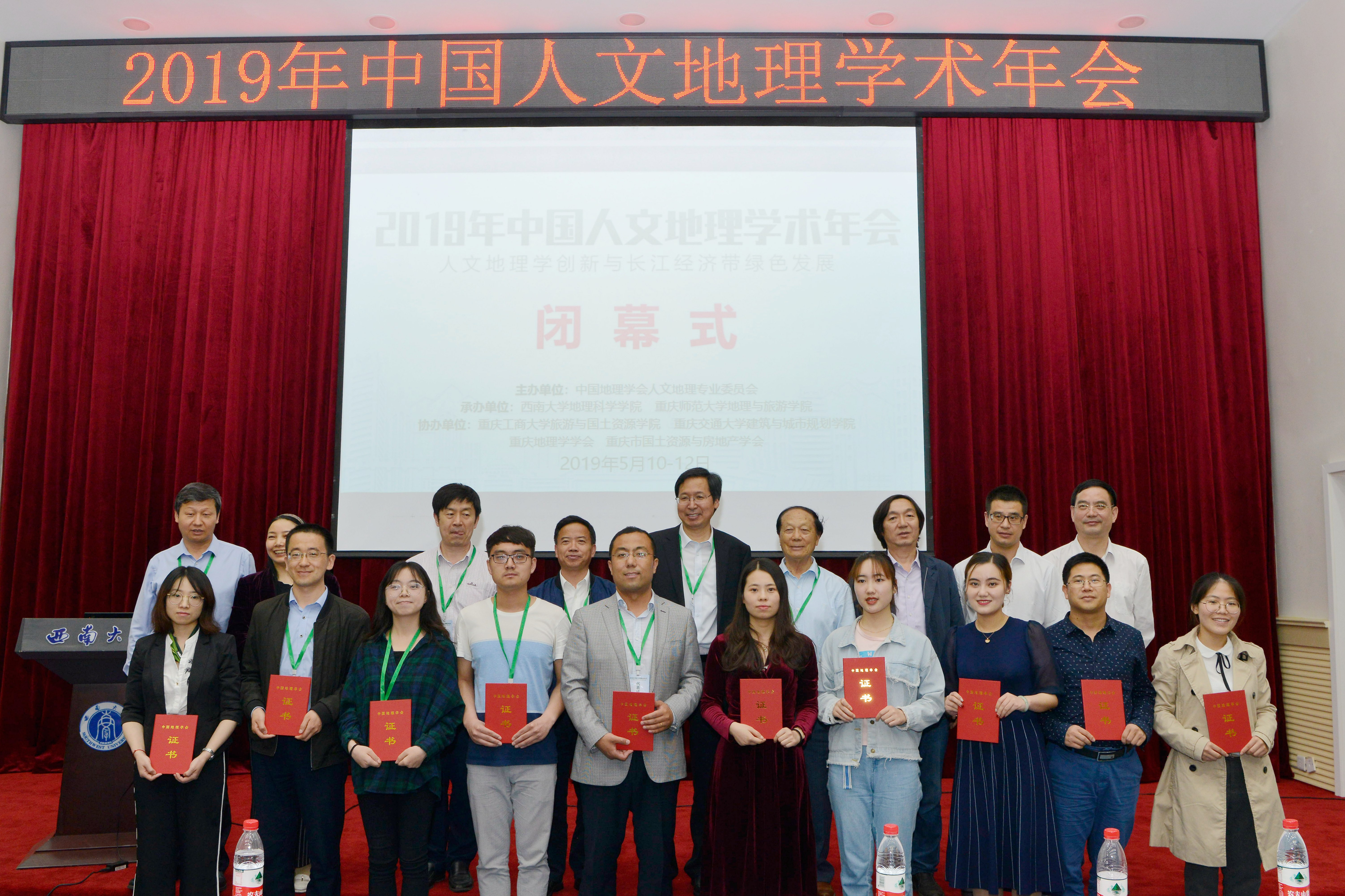 5月12日下午,大会闭幕式在52手机a片 桂园宾馆金桂厅举行。闭幕式由中国地理学会人文地理专业委员会副主任宋金平教授主持。中国地理学会人文地理专业委员会主任方创琳研究员作了大会总结发言。他对承办单位和志愿者细致而周到的服务表示感谢,表示此次大会主题鲜明、专题突出、学科融合,是一次成功高效且富有特色的会议。他强调,人文地理学者需要共同努力,进一步挖掘人文地理学的理论,创新人文地理学的方法和方法论,更好地为国家重大战略需求服务。闭幕式上还颁发了本次大会青年优秀论文奖,中山大学地理科学与规划学院博士研究生吴蓉、52手机a片 博士研究生苏康传等10位青年学者获此殊荣。浙江大学地球科学学院副院长程晓敢教授在闭幕式上接过中国人文地理学术年会会旗,并向与会代表发出2020年10月在浙江大学举办2020年中国人文地理学术年会的邀请。