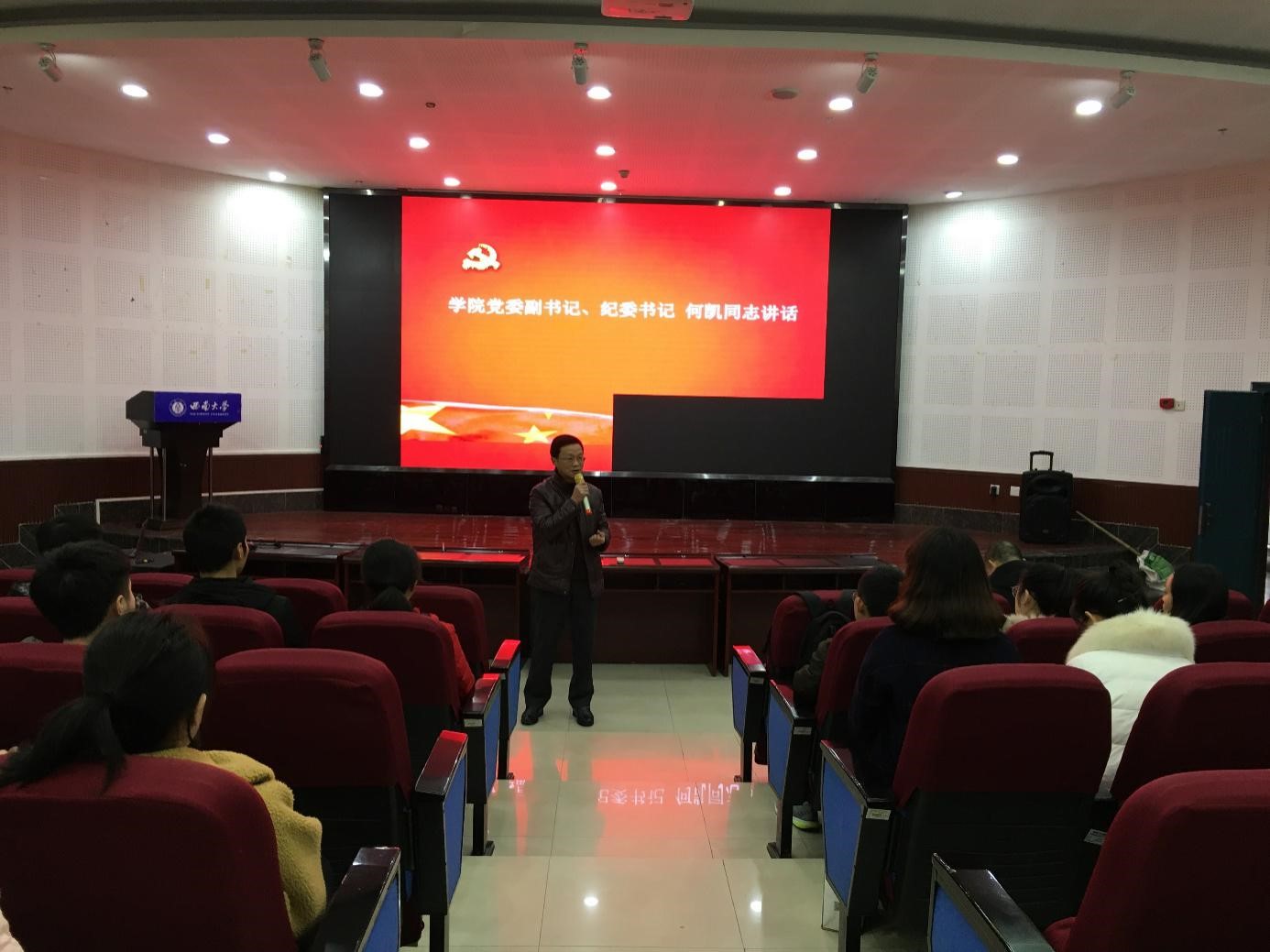 52手机a片 “不忘初心,牢记使命”主题教育活动系列之——“奋斗的我,最美的国”宣讲活动于2019年12月13日在52手机a片 101报告厅举行。出席本次活动的有学院党委副书记、纪委书记何凯同志,学院副院长王勇同志,52手机a片 全体学生党员、积极分子参加。