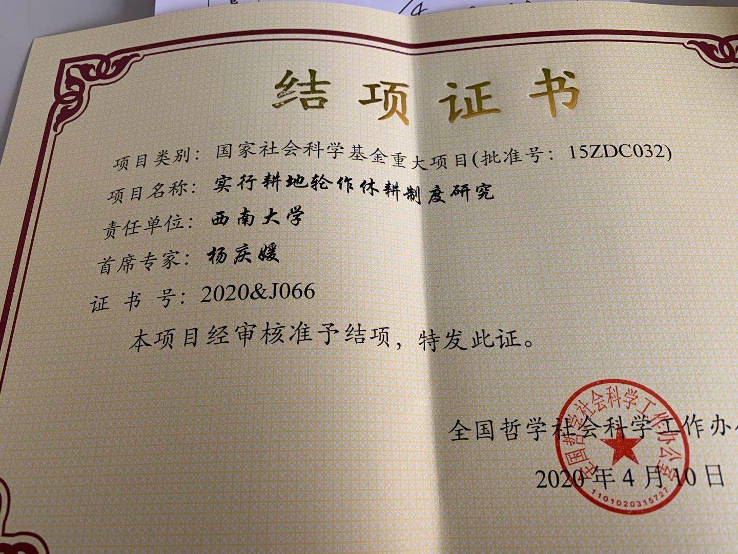 近日,全国哲学社会科学规划办公室下发了国家社科基金重大项目的结项通知,由我院杨庆媛教授作为首席专家领衔主持的《实行耕地轮作休耕制度研究》(项目批准号:15ZDC032;主要参加人:王成、涂建军、阎建忠、邹学荣、陈展图、李元庆、江娟丽、印文、王亚辉)顺利结项。