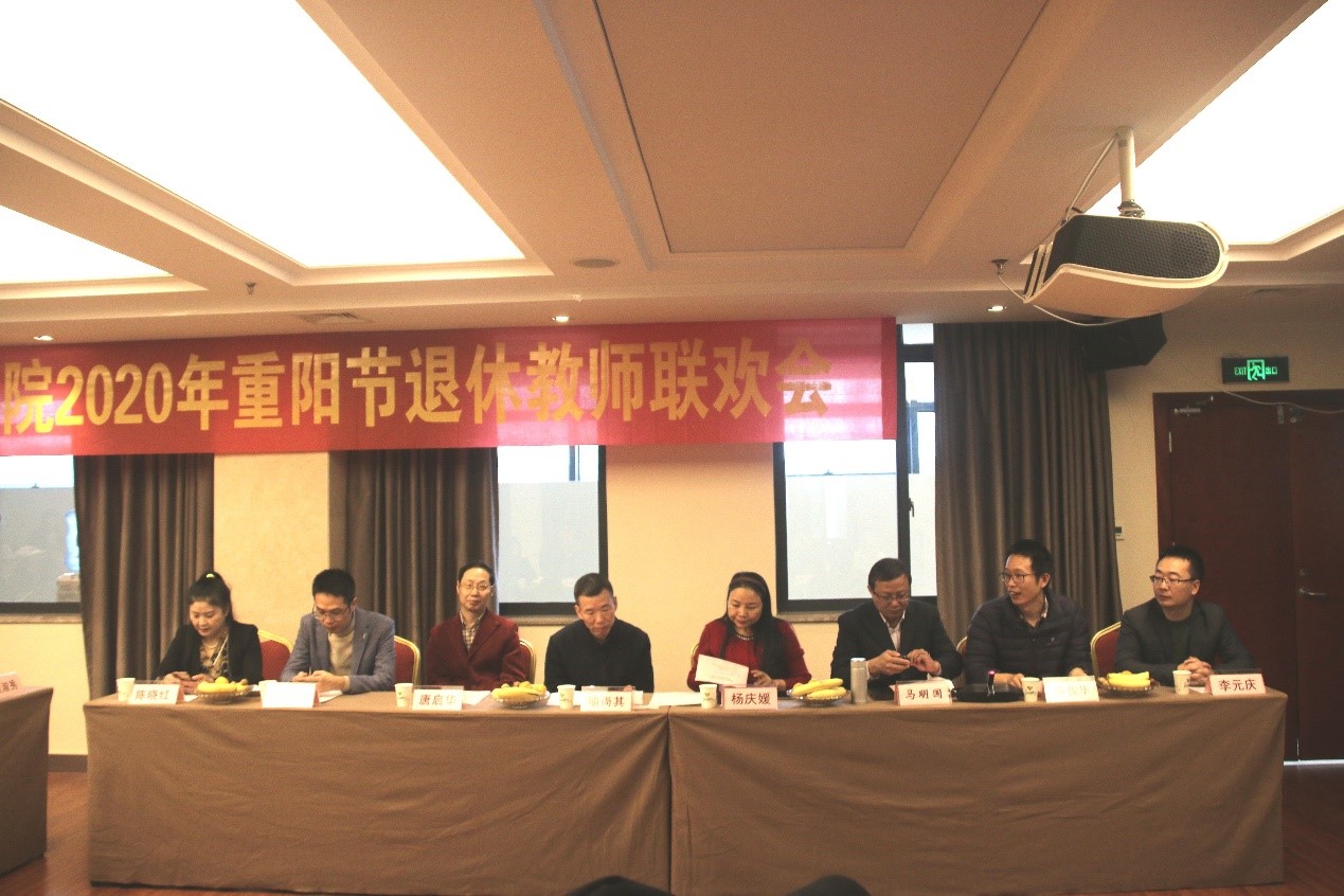 10月21日上午,我院“2020年重阳节退休教师联欢会”在桂园宾馆四楼会议室顺利召开,学院党委书记喻尚其、副院长杨庆媛、党委副书记唐启华、副院长马明国出席了会议,汤旭光、韩旭军等青年教师代表、工会成员及相关工作人员参加了会议,工会主席、教代会主任陈俊华主持会议。