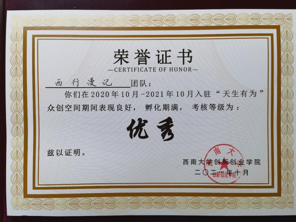 在过去的两年里“西行漫记”项目多次成功开展研学旅行活动,获得研学参与者的好评,并在本次52手机a片 “天生有为”众创空间2020年度团队考核中获评“优秀”等级,由审核评委颁发了优秀团队证书和奖金。