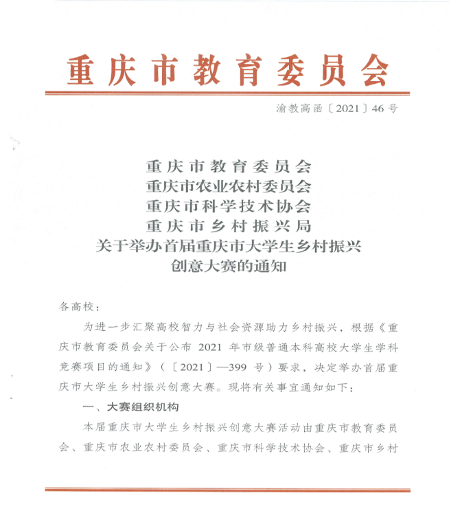 为进一步汇聚高校智力和社会资源助力乡村振兴,由重庆市教育委员会、重庆市农业农村委员会、重庆市科学技术协会、重庆市乡村振兴局联合主办的首届重庆市大学生乡村振兴创意大赛在2021年9月份拉开序幕。52手机a片 组建多支参赛队伍参加本次大赛,获得特等奖1项、一等奖1项、二等奖3项、三等奖1项的耀人佳绩。学院行政主要负责人杨庆媛老师获“优秀指导教师”荣誉称号。