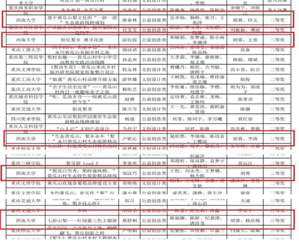 此外,熊春林等同学制作的作品《基于黄瓜山村梨文化‘一龄一游’生态旅游路线规划》、温仪霞等同学制作的作品《拾忆梨乡 漫寻花迹》、卢铭沁等5位同学制作的作品《‘生态黄瓜山,梨乡永不‘梨’’永川黄瓜山村生态旅游精品路线》、邹汶巧等同学制作的作品《‘梨花白雪香,梨岭漫纵横’黄瓜山村生态特色旅游精品路线》荣获得大赛二等奖。蔡舒桐等同学制作的作品《七彩山梨——红绿蓝三色主题游》荣获大赛三等奖。
