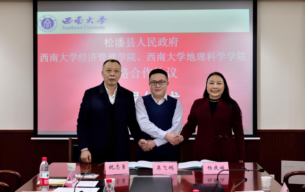 会上,吴飞鹏副县长对我院及经济管理学院长期以来的关心和支持表示了感谢。吴飞鹏副县长介绍了松潘县的历史文化背景、经济社会发展和十四五规划等相关情况,同时就推进三方校地合作项目提出三点希望:一是聚焦服务大局,促进合作共赢;二是聚焦后勤保障,促进成果转化;三是聚焦统筹协调,促进合作创新。我院及经济管理学院行政主要负责人对松潘县各位领导的到来表示了欢迎,围绕本学院的发展历程、学科优势、师资队伍建设等方面做了介绍,并表示本次校地合作将注重发挥各自优势,务实推进项目落地,助力校地合作结出丰硕成果。三方就人才培养培训、人才互派交流、科技创新、战略决策咨询、文化旅游交流、生态文明建设和乡村振兴等内容进行对接,围绕支持松潘县经济发展、乡村振兴、社会治理等领域的合作事项进行深入探讨,达成合作意向并签订合作备忘录。