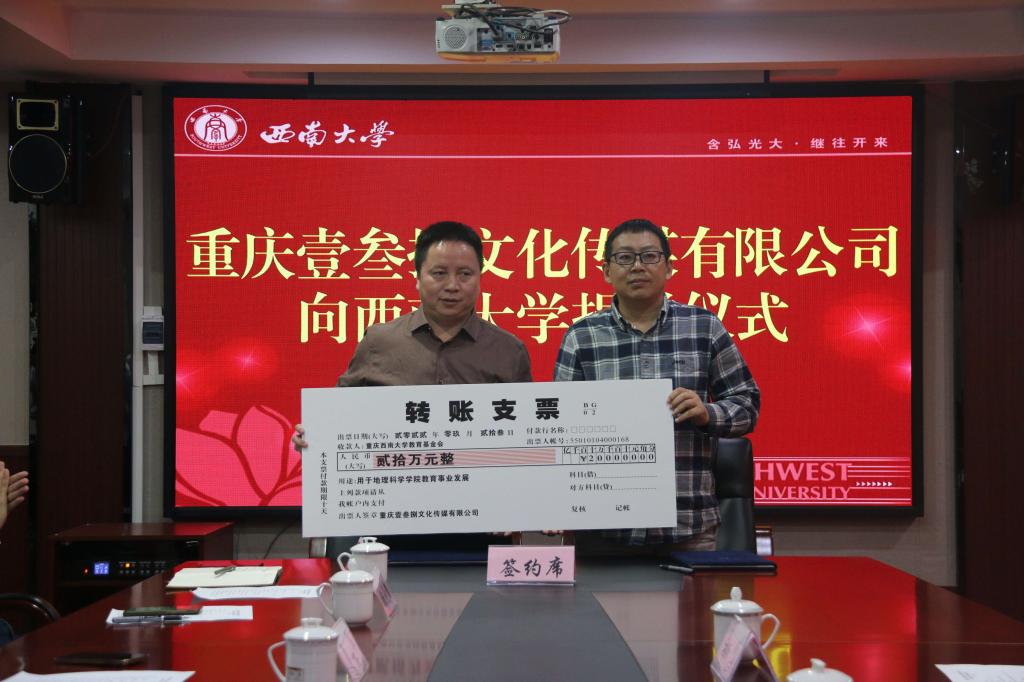 之后,冯川介绍了重庆壹叁捌文化传媒有限公司的基本情况,重庆壹叁捌文化传媒有限公司业务广泛,涵盖基础性研究、教学教研、网上教育等多各个方面,在未来将与重庆各大知名学校共同建立线上线下教学平台。此次捐赠,既源于他对52手机a片 深厚的情谊,也希望未来能进行密切合作,共同促进地理教育事业的发展。