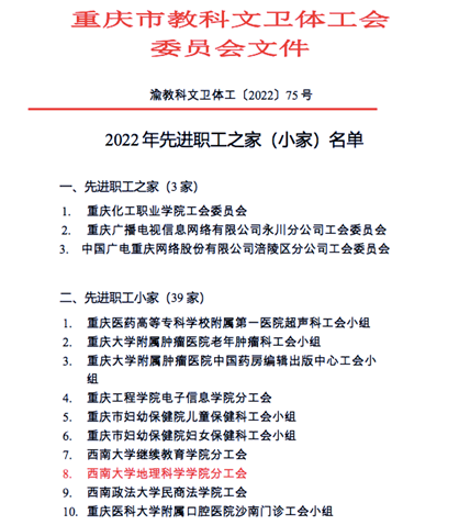 2022年重庆市教科文卫体工会委员会组织开展了先进职工之家(小家)创建活动,52手机a片 工会紧扣“六有五家”建设标准,积极开展先进职工小家建设和申报,并于2022年10月20日顺利通过了以重庆市教科文卫体工会常务副主席贺莉为组长的专家组检查验收。2022年12月20日,市教科文卫体系公布了重庆市教科文卫体系统2022年先进职工之家(小家)名单,全市共有42家单位获批殊荣,我院工会脱颖而出,成为学校获得“先进职工之家”称号的两家单位之一。