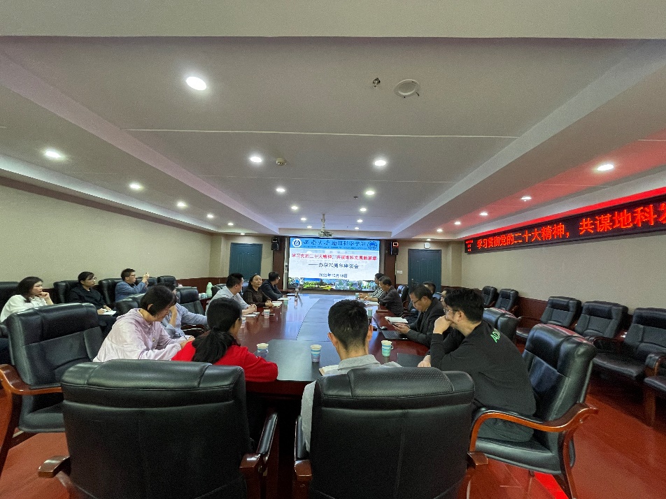 10月18日下午,学院组织召开“深入学习宣传贯彻党的二十大精神,共谋地科新篇章”务虚会。学院党政领导班子、自然地理与教师教育系、人文地理与城乡规划系、地理信息科学系等系主任及部分教师代表参会,会议由学院行政主要负责人主持。