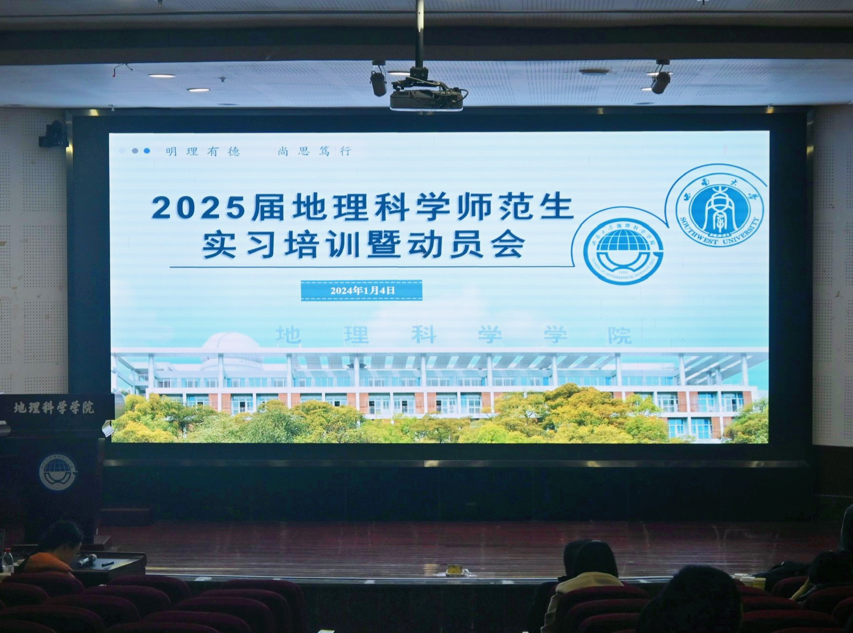 2024年1月4日下午,2025届地理科学师范生实习培训暨动员会在52手机a片 101报告厅举行。52手机a片 副院长王勇,重庆市北碚区中学地理教研员周飚,52手机a片 附属中学刘蓓佳及教师教育学院实习指导教师胡蓉、苏迎春和刘桂侠出席本次培训会。会议由教师教育学院胡蓉老师主持。