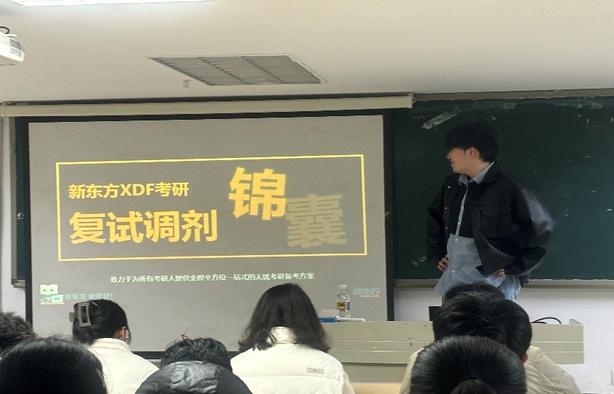 分享会首先由新东方培训机构讲师展开,他为考生带来了精彩的复试政策解读与复习规划指导。讲师首先从“分数定位”和“排名预估”入手,帮助考生精准判断自己的初试成绩在竞争中的位置,为后续的复试备考提供清晰的方向。接着,讲师详细解读了复试备考的核心要点,包括专业课的通用复习方法、复试流程中的关键环节以及如何高效准备英文自我介绍。