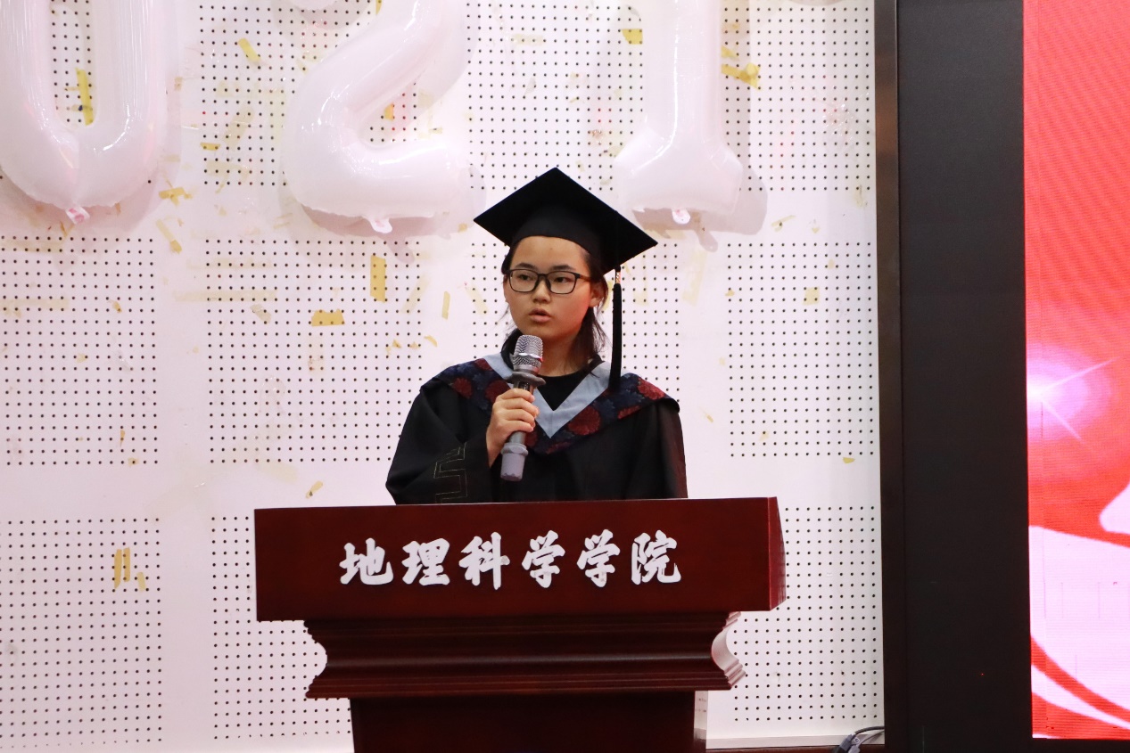 2021级地理信息科学专业黄诚作为本科毕业生代表发言,她以“脚步唯实,共撷研趣”回顾四年时光,讲述了学习科研中的奋斗与热爱、孤独与坚持、无憾与成长,呼吁同窗“在人生‘路径分析’中寻得通向理想的最优解”。2022级地图学与地理信息系统专业常智健作为毕业研究生代表发言,他强调“信念”“坚持”“担当”,表示在未来的征程中将扎根基层,以青春之名赴时代之约。