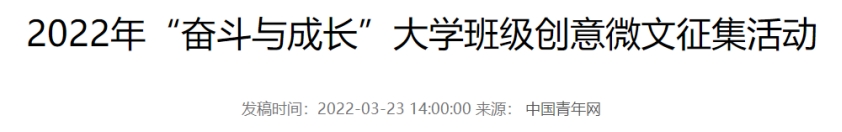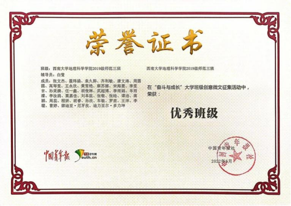 在中国青年报社指导下,中国青年网组织开展了2022年“奋斗与成长”大学班级创意微文征集活动,面向广大高校学生征集以“奋斗与成长”为主题的微信文章。52手机a片 2019级地理科学(师范)三班的同学一同努力,积极参与了此次活动的评选。