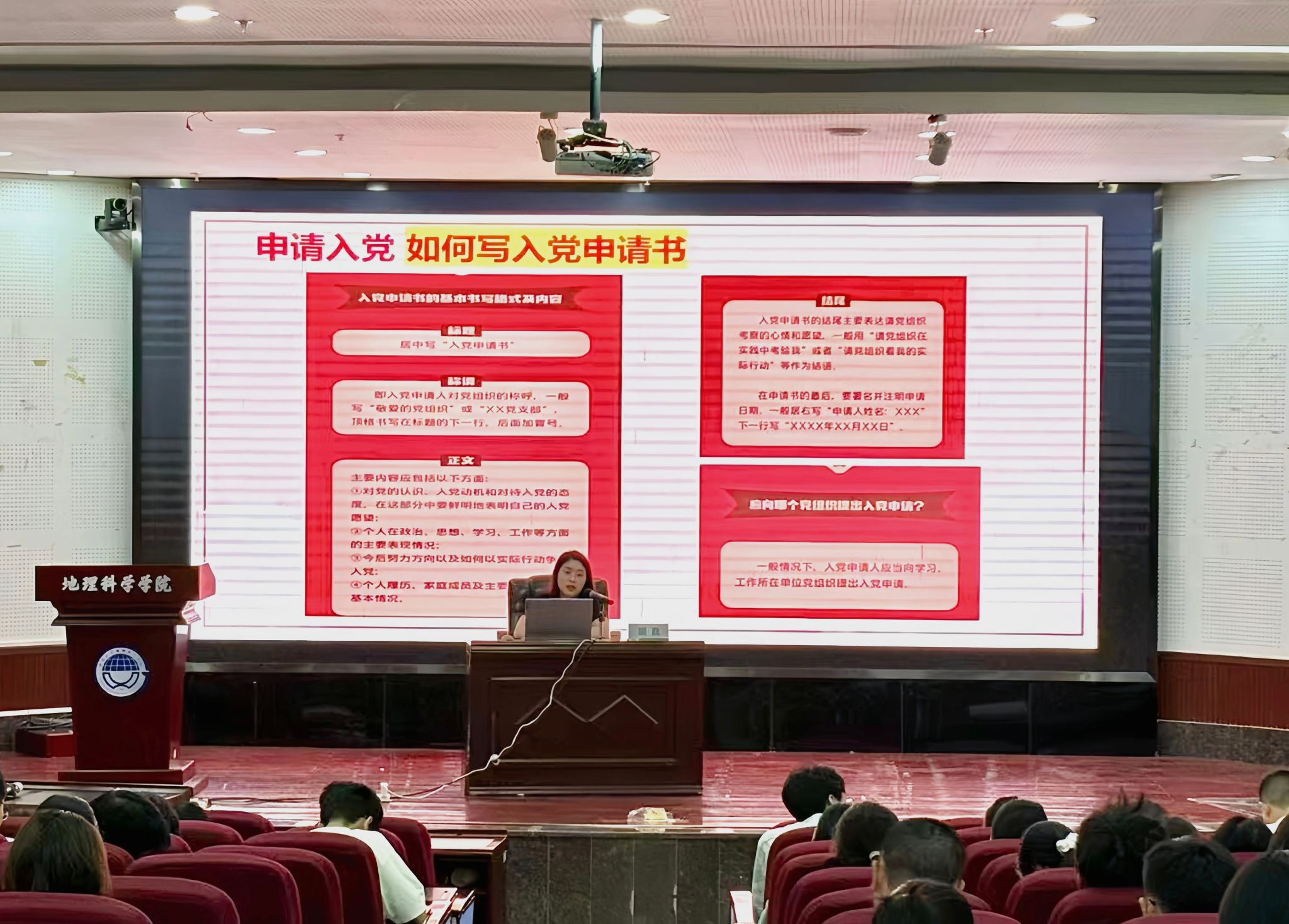 胡孜老师强调,递交入党申请书是政治生命中一件严肃而神圣的事情,每位同学都应根据个人情况和入党意愿,在深入学习和慎重思考后自主做出选择。同时鼓励新生要严格要求自我,坚定理想信念,自觉接受党组织的培养教育和考察,争取早日成为一名合格的中国共产党党员。